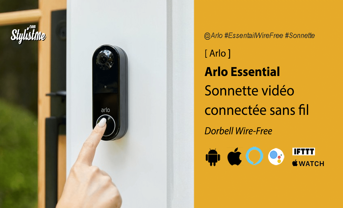 - La sonnette Arlo Essential apporte un meilleur angle de vue (1:1) et la compatibilité Google Assistant, IFTTT et Apple Watch en plus d’Amazon Alexa. Elle permet aussi à vos visiteurs de vous laisser un message audio comme sur un répondeur si vous ne répondez pas.
