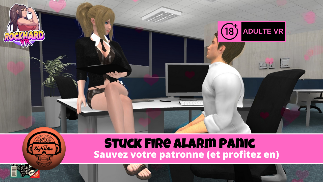 Le scénario de Stuck Fire Alarm Panic se déroule dans un bureau classique, tard le soir, où l’ambiance est à la fois tendue et humoristique. Vous découvrez rapidement que votre patronne, Miss Faye Fox, est coincée dans le rebord de la fenêtre des toilettes. L’objectif principal est de l’aider avant que l’alarme incendie ne mette tout le monde en fuite. Cette situation crée un mélange surprenant entre comédie, suspense et tension sexuelle, le tout en VR. Le jeu rappelle certains aspects des premiers jeux VR interactifs à choix multiples mais avec un niveau de détail et de personnalisation rare dans le genre adulte.