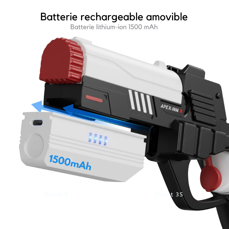L’installation est clairement l’un des points forts des APEXINNO G1. Vous rechargez les batteries, vous les glissez sous le canon, vous insérez vos contrôleurs Quest 3, 3S ou Pro, et c’est terminé. Aucun appairage Bluetooth, aucun logiciel, aucun réglage.