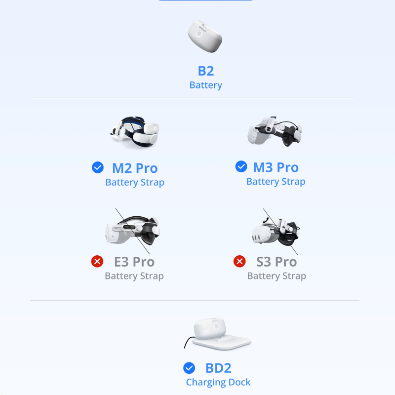 Le B2 est compatible avec toutes les sangles BOBOVR M1, M2, M3 et la sangle P4S. En revanche, il n’est pas compatible avec la sangle S3 Pro. Si vous utilisez déjà une sangle BOBOVR ancienne génération, le B2 reste une mise à niveau simple et efficace pour gagner en autonomie et en confort.