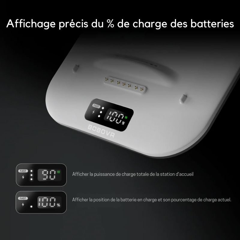 Dans un usage réel, cela signifie que vous pouvez enchaîner les sessions VR sans attendre des heures. Pendant que vous jouez avec une batterie, les autres se rechargent efficacement en arrière plan.