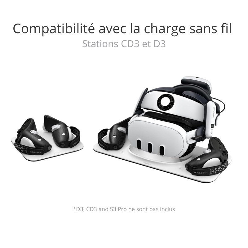 Mais le véritable avantage comparatif pour les utilisateurs de la marque est la compatibilité native avec les stations de charge sans fil CD3 et D3. Vous pouvez ranger et charger vos manettes sans jamais avoir à retirer les grips. C’est un gain de temps précieux qui rend votre setup VR plus fluide et professionnel.