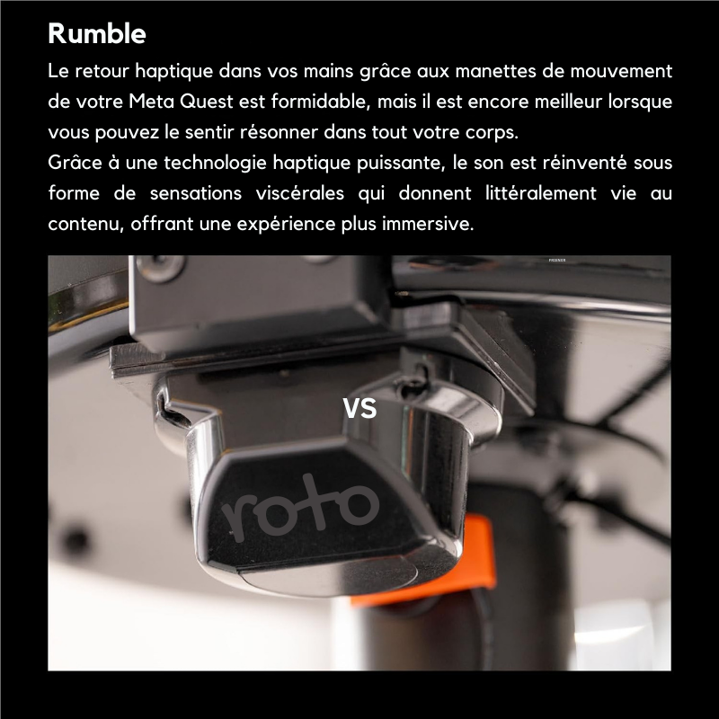 Avec le pack Rumble, le Roto VR Explorer ajoute une dimension haptique intéressante. Les vibrations sont générées à partir de l’audio du jeu et se diffusent dans toute la structure de la chaise. Explosions, impacts ou moteurs deviennent perceptibles dans le corps, et pas uniquement dans les mains via les contrôleurs. La puissance du Rumble est réglable directement sur la base de la chaise, ce qui permet d’adapter l’intensité selon vos préférences et votre tolérance.