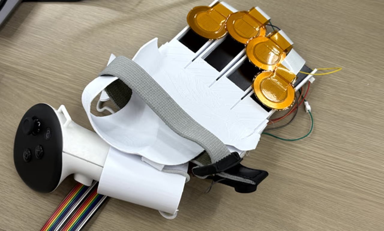 L’intégration d’une correction optique étendue est un réel plus pour les utilisateurs myopes : la possibilité d’intervenir sur la dioptrie évite d’enfiler des lentilles additionnelles et limite la perte du champ visuel. Sharp a aussi présenté un contrôleur haptiques de type exosquelette qui transmet des textures via une membrane, une approche pratique pour une mise en place rapide en environnement partagé. Elle sacrifie une partie de l’amplitude des doigts comparée aux gants haptiques mais gagne en simplicité d’usage.