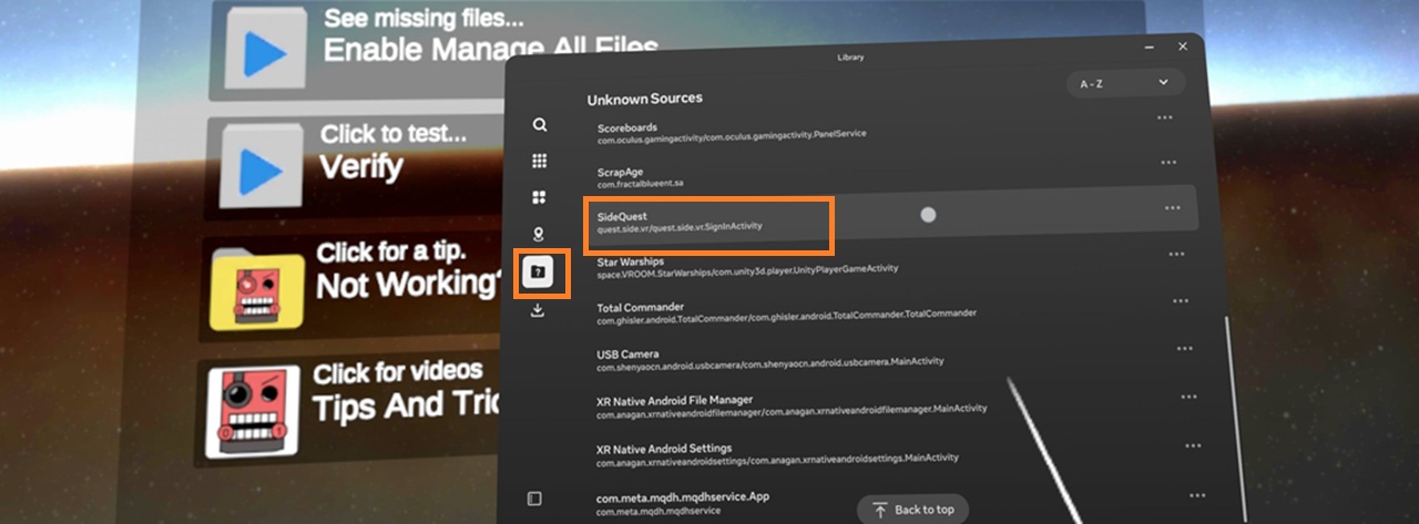 - Lancez SideQuest depuis la section « Sources inconnues » de votre bibliothèque d’applications
